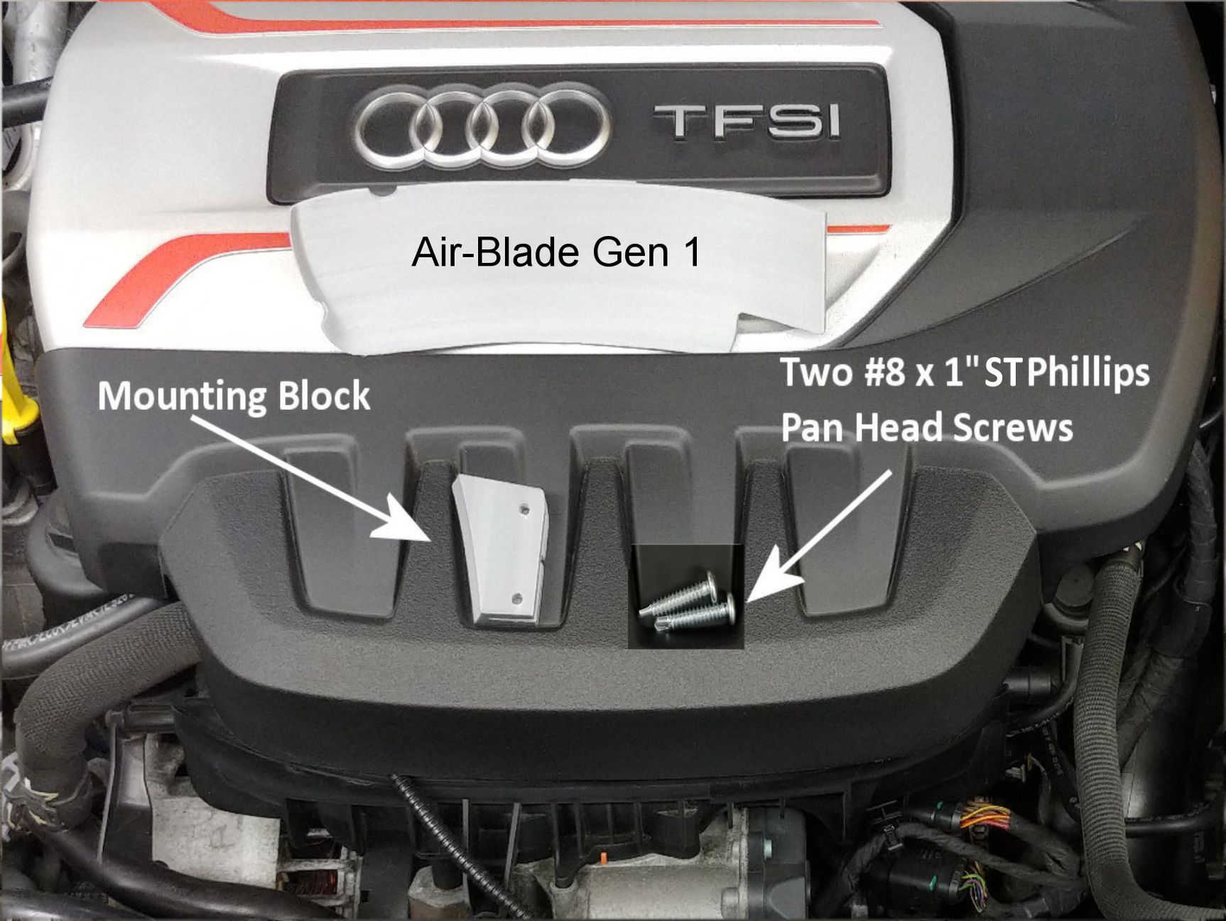 All pictures below are clickable so you can zoom in for a better view Kit contains: one Air Blade - one Mounting Block - 2x #8 x 1 in. Self Tapping Phillips Pan Head Screws or 2x #8/32 x1 in. Bolts with Nylon Locking Nuts.